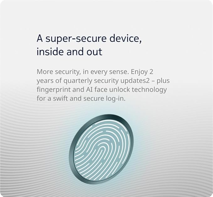 • Clean OS with 2 years of quarterly security updates, biometric fingerprint, and AI face unlock for more space and more freedom.